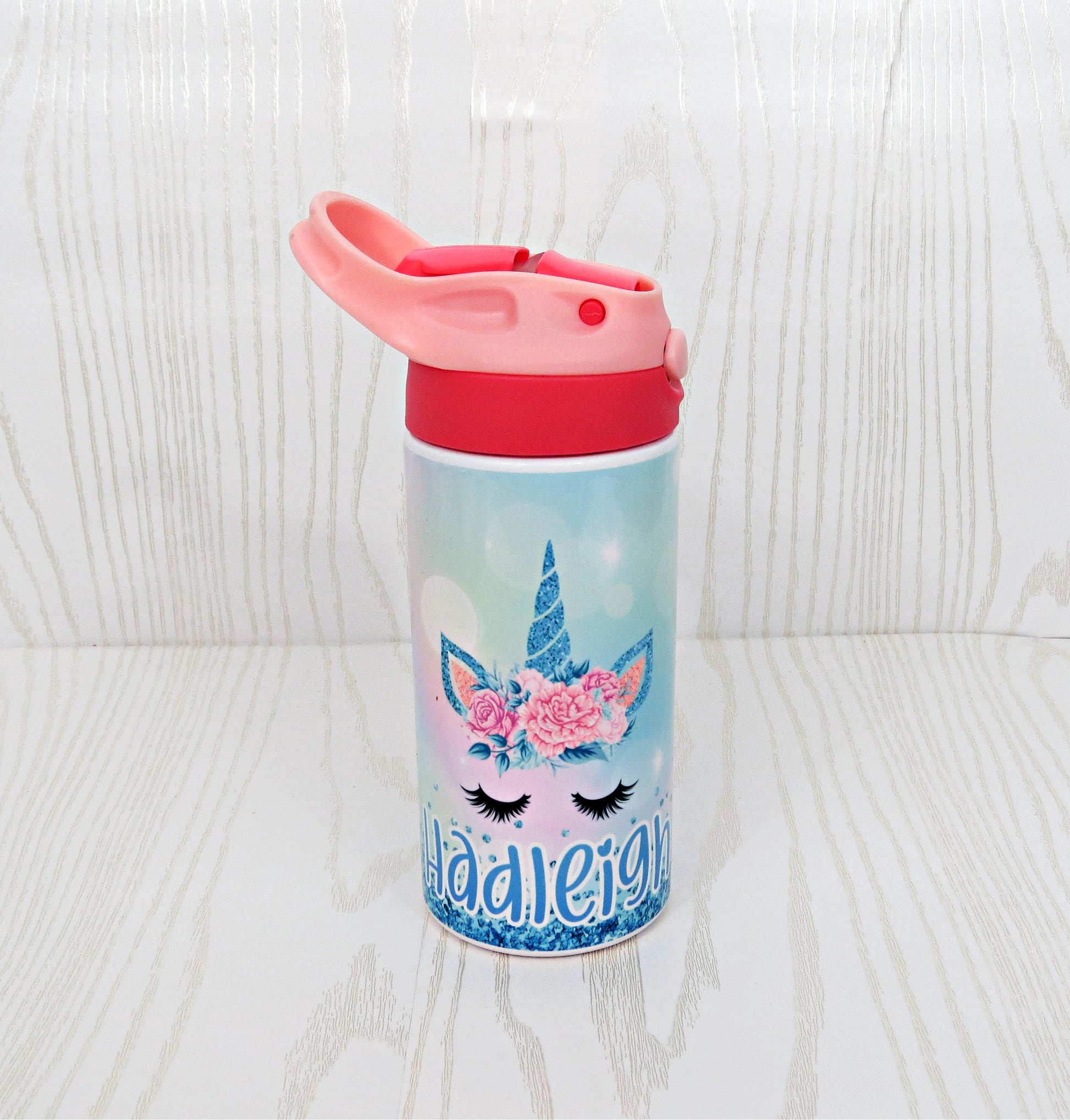 12 oz Stainless Steel Personalized Unicorn Horn Tumbler - Girls Water Bottle - Flip Top - Insulated Reusable - Straw - Custom with Handle