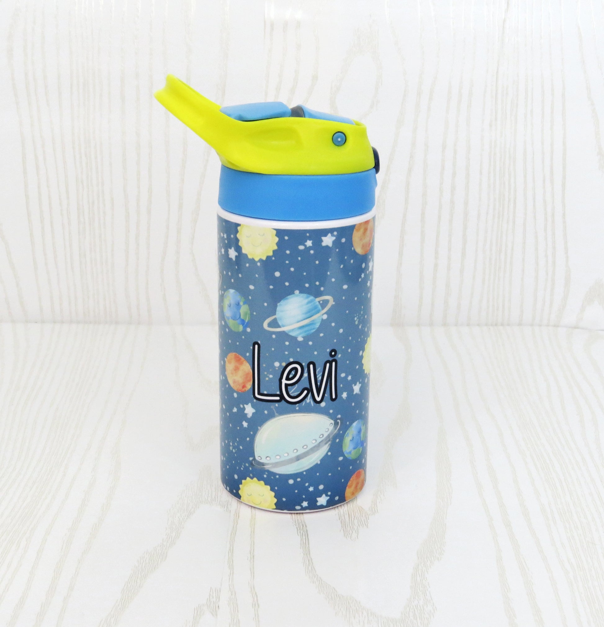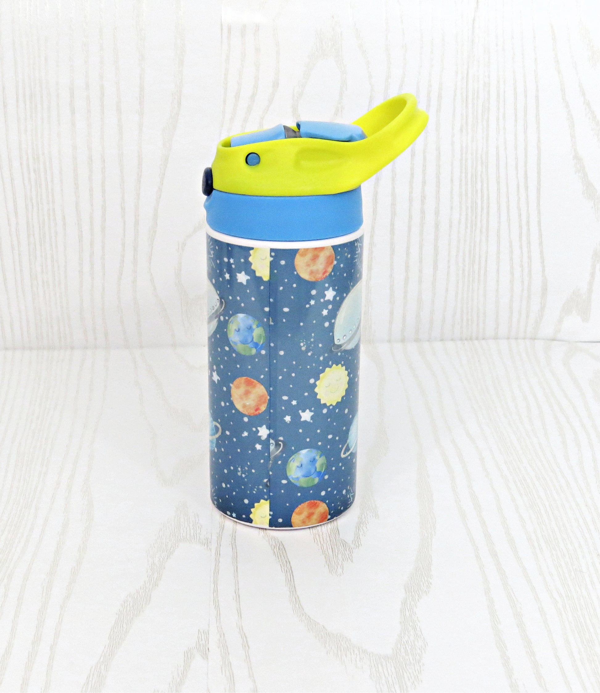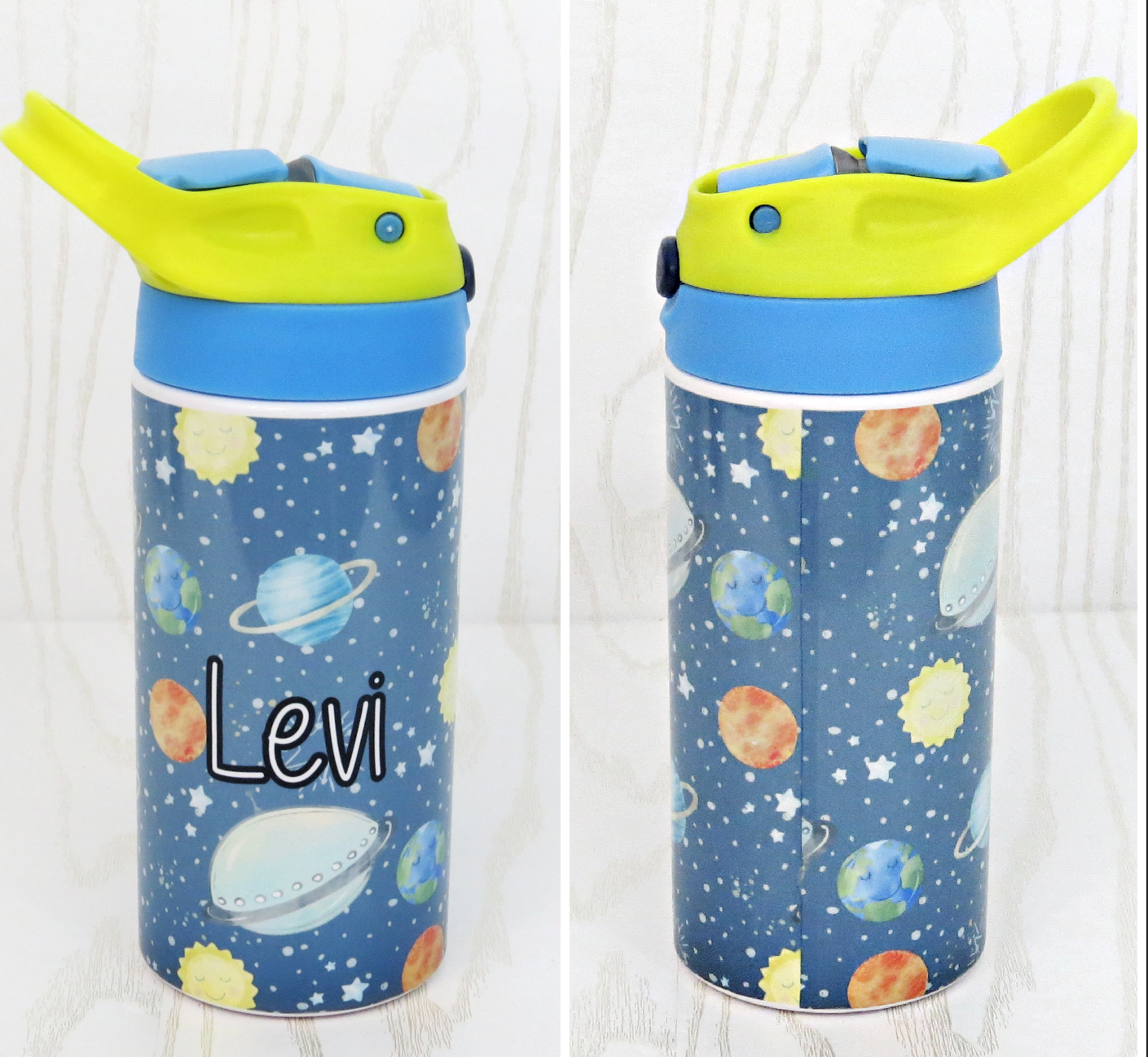 12 oz Stainless Steel Solar System Tumbler - Boys Outer Space Water Bottle - Planets Flip Top - Insulated Reusable - Straw - Personalized Custom with Handle