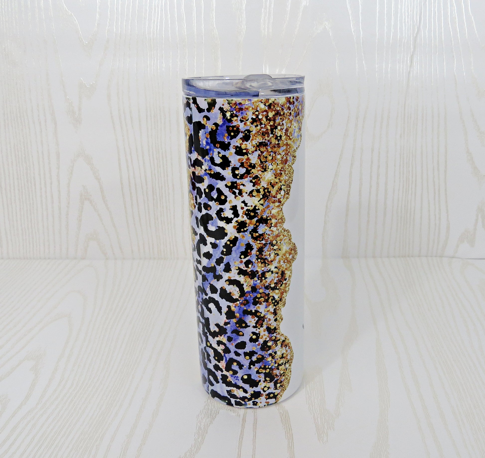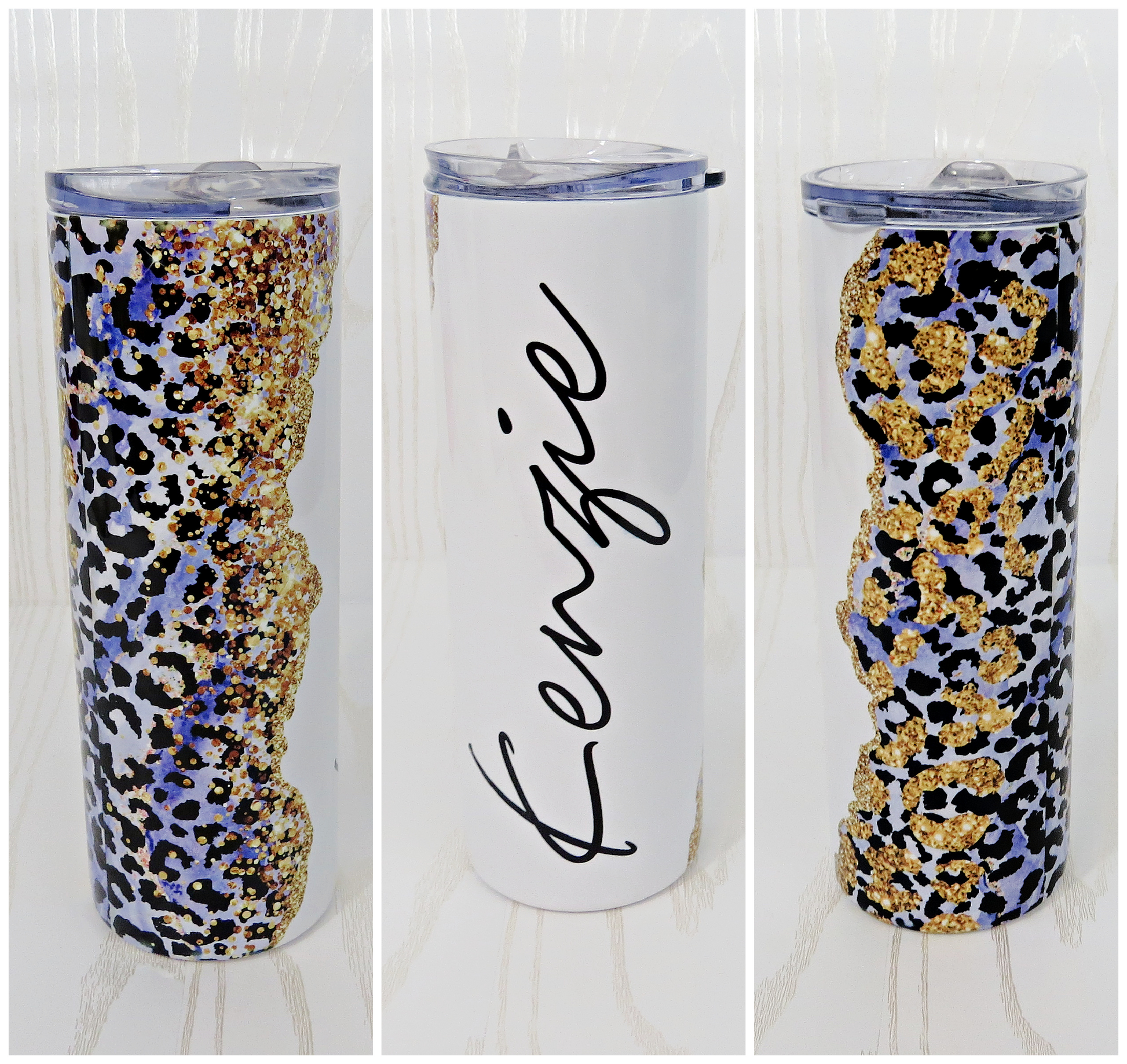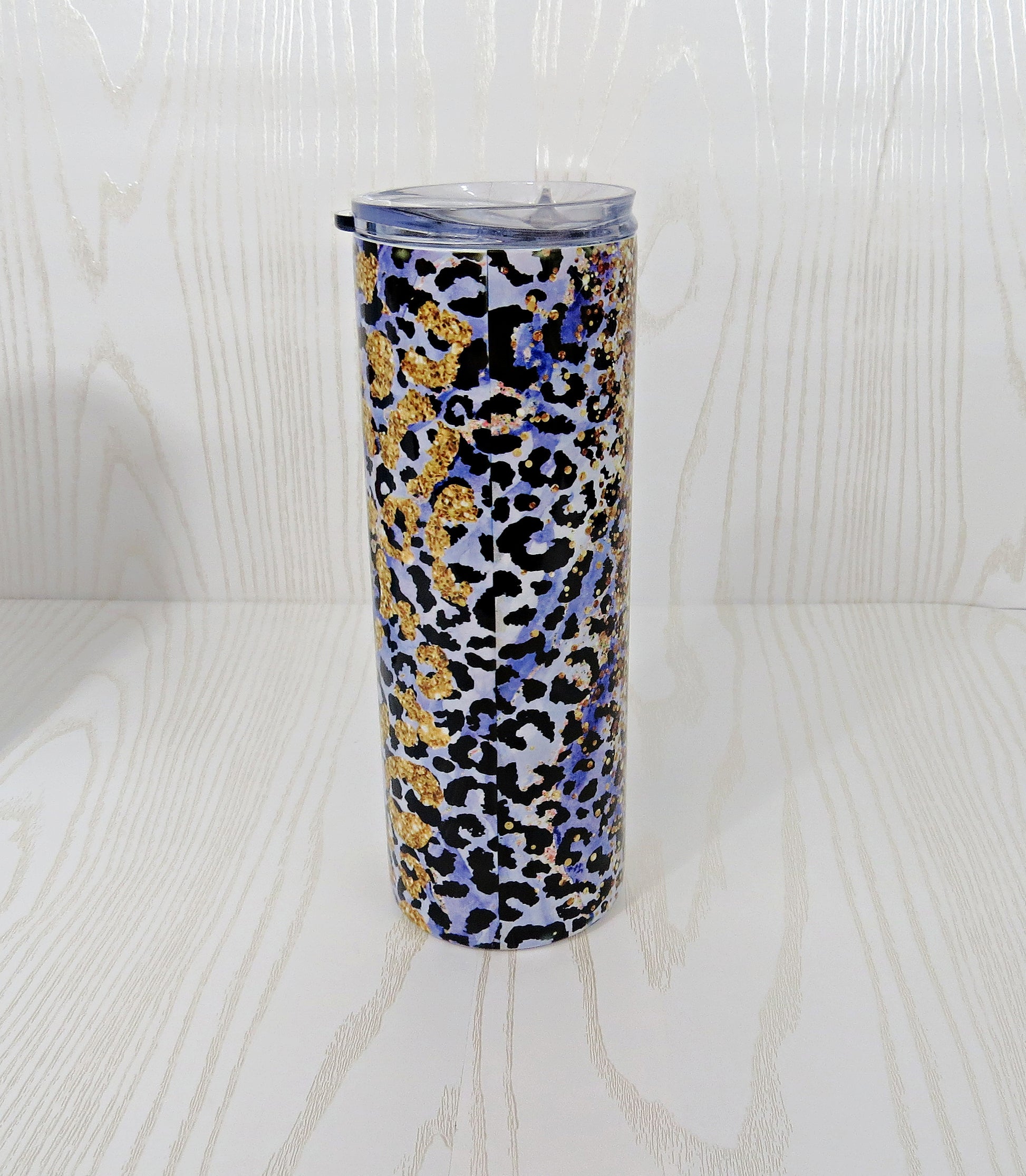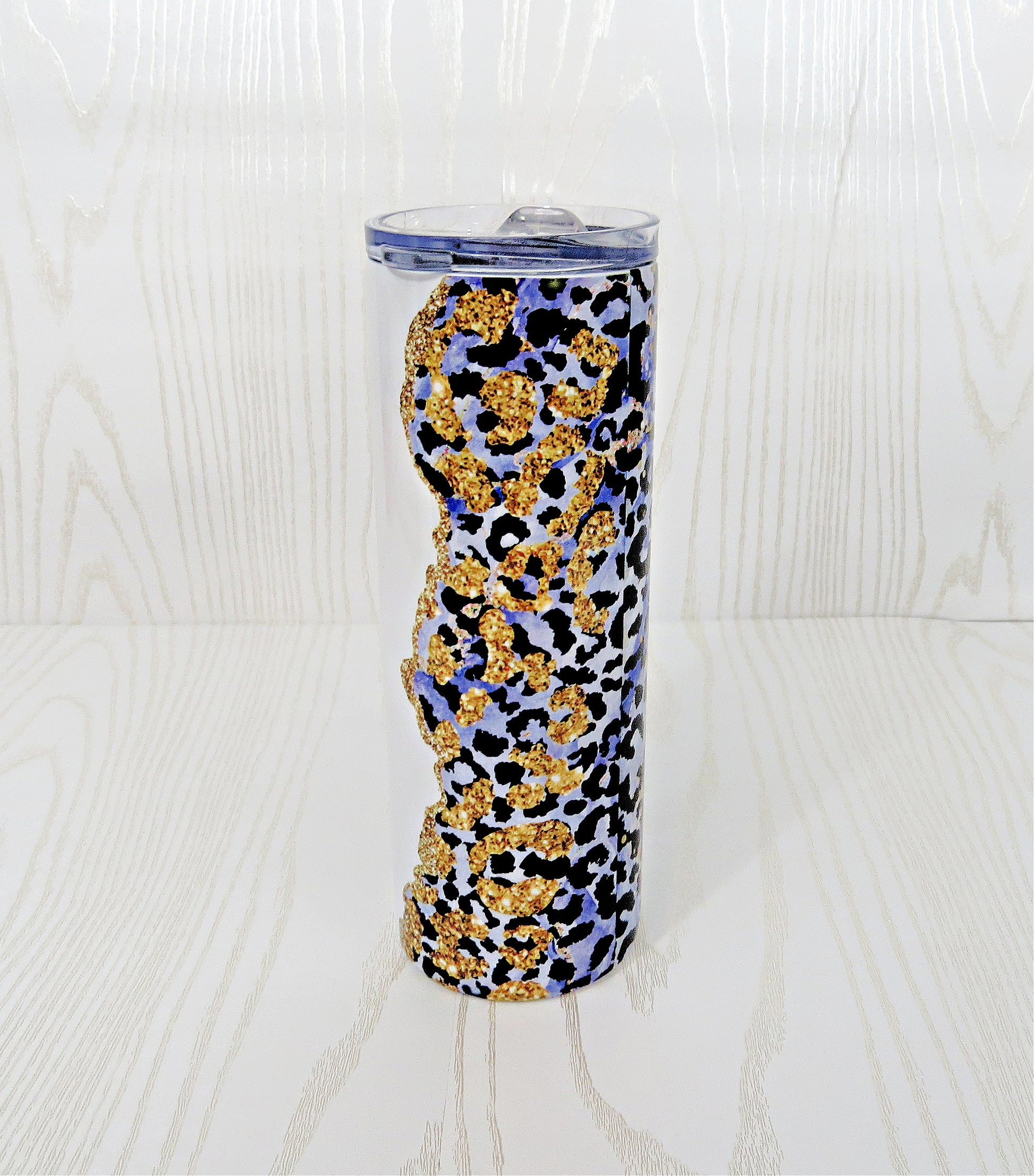 20 oz Purple Gold Leopard Cheetah Stainless Steel Skinny Tumbler with Personalized Name Decal - Includes Straw and Lid – Kids Girls Gift – Bridesmaid – Bachelorette - Bridal Party Gifts - Mother's Day - Birthday