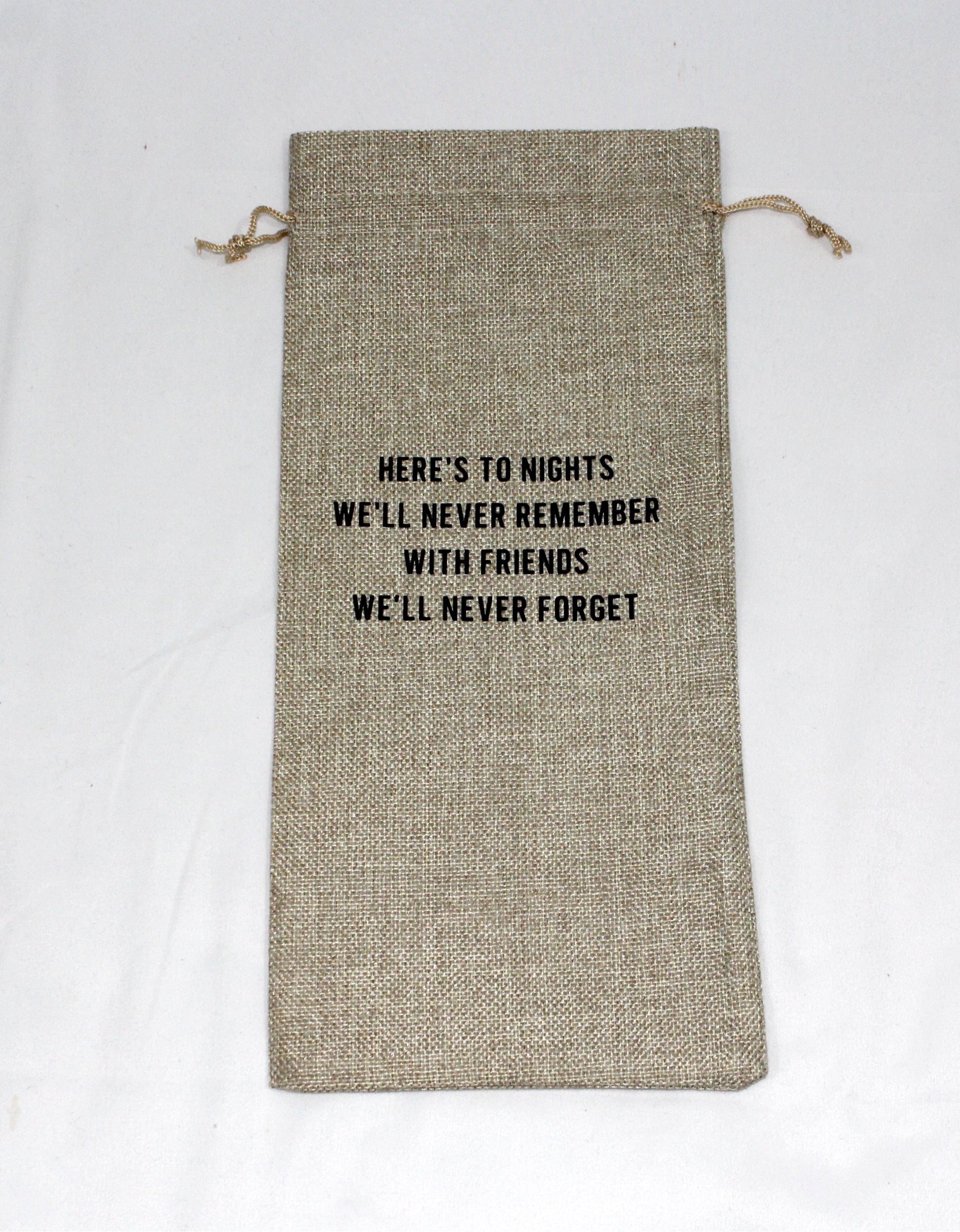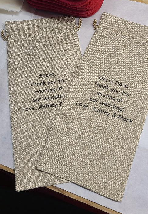 This Custom Wine Bag can be customized and personalized to just about anything you need. I put the words in the best layout to fit the bag space. There is a limited amount of space on each bag so I cannot do paragraphs or long phrases as the wording becomes too small. If the order is placed and I cannot fit the wording on the bag I will message you and discuss our options.