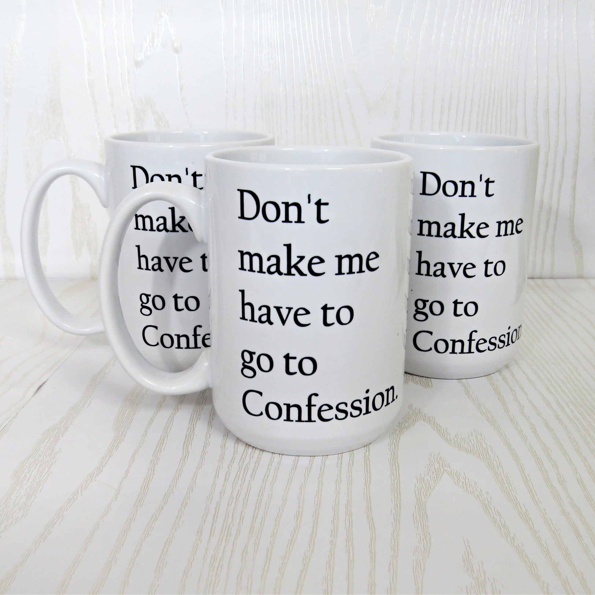 - HUMOROUS DESIGN: Features a witty Catholic-themed message 'Don't make me have to go to Confession' printed in clear black text on a white ceramic mug