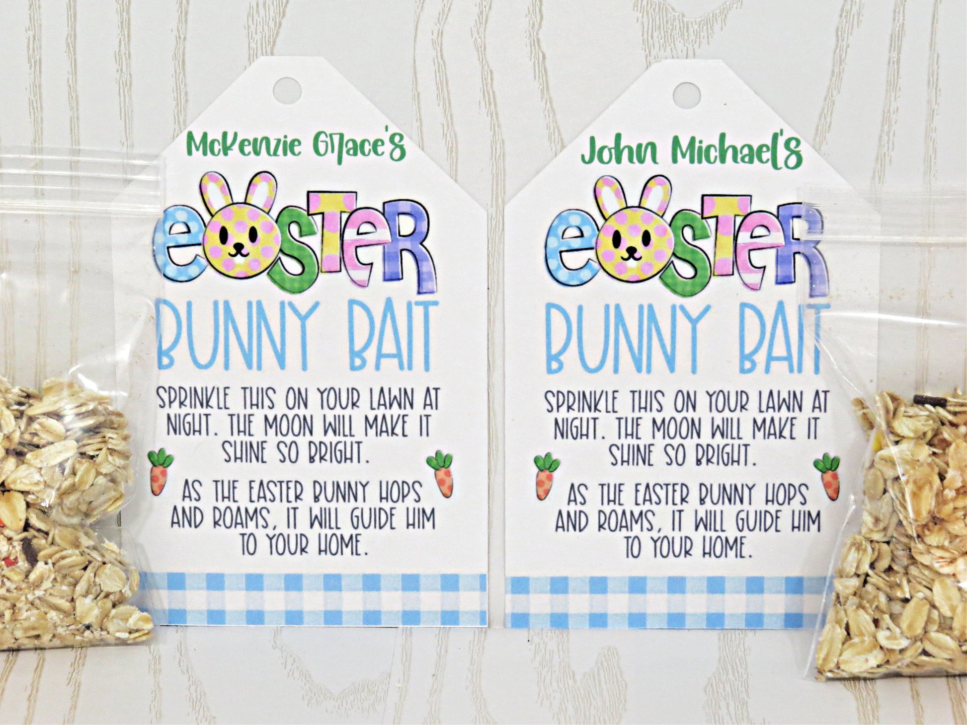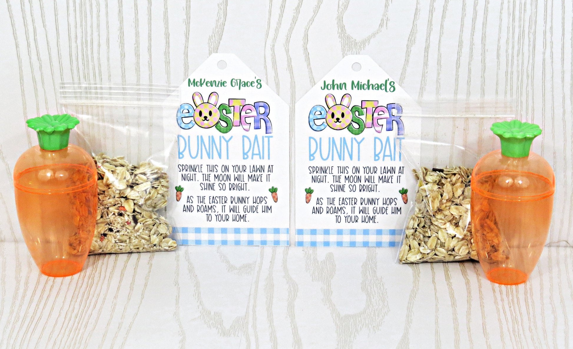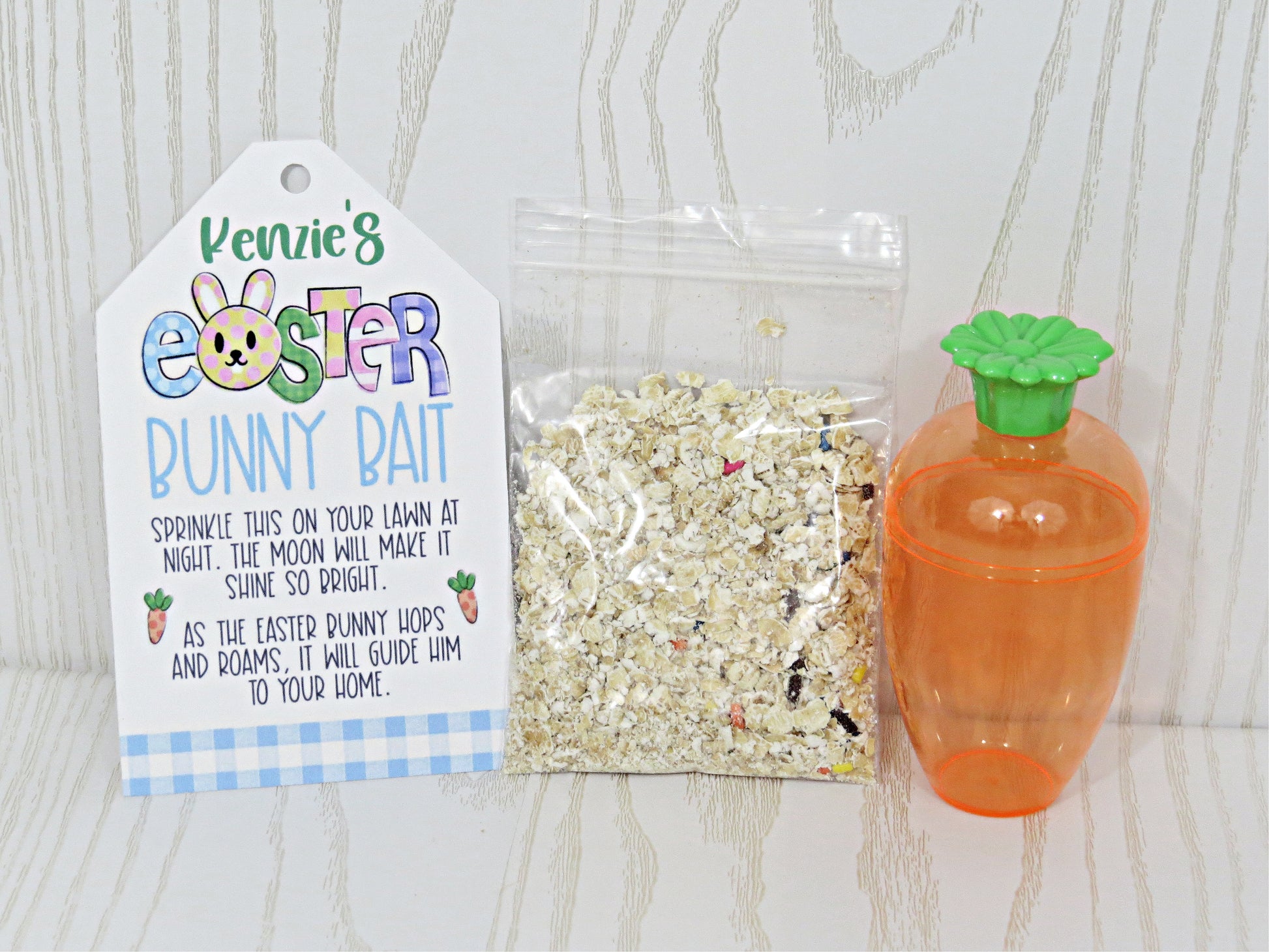 WHEN ORDERING INPUT THE NAME YOU WANT ON THE TOP OF THE CARD. Comes with the Bait Card, Carrot Easter Egg and Bunny Bait (Oats & Sprinkles)!