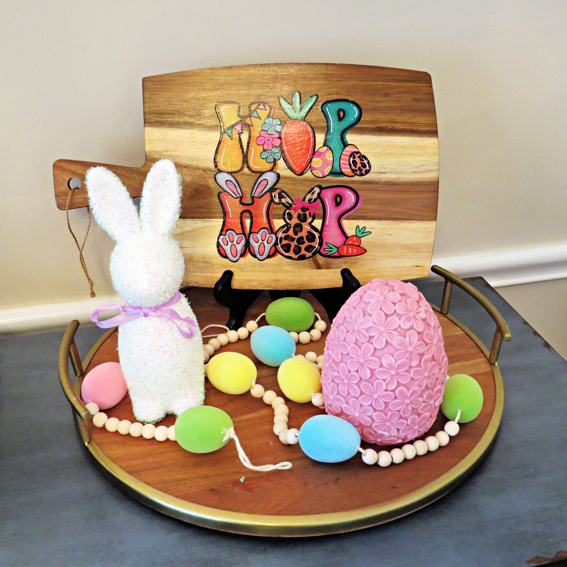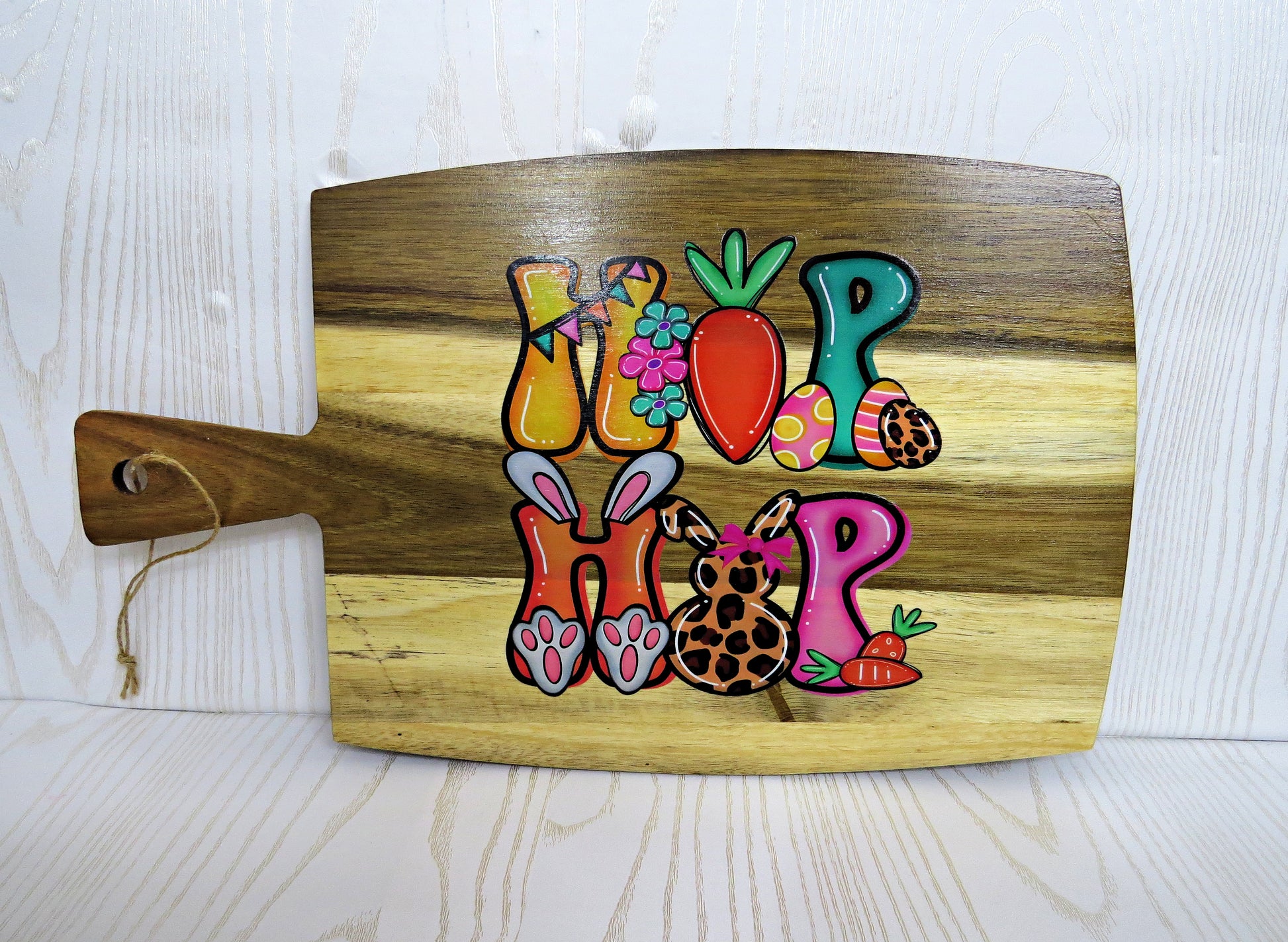 DECORATIVE DESIGN: Charming Easter-themed cutting board featuring an adorable Hip Hop phrase with bunny ears, Easter eggs, and spring flowers on rustic wood background