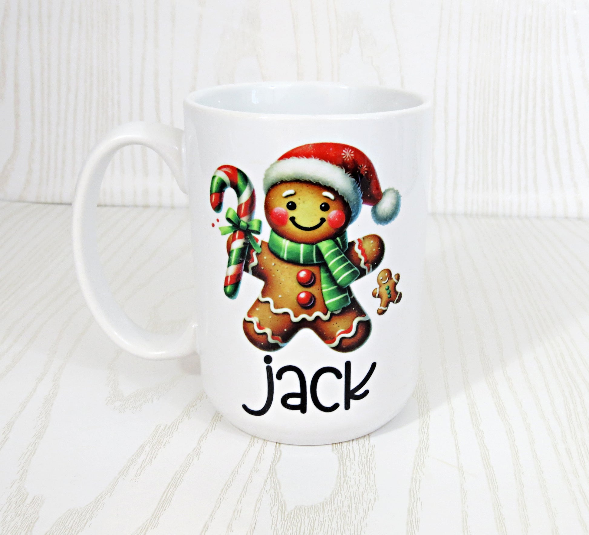 Add some holiday cheer to your cocoa routine with this personalized gingerbread Christmas mug! Featuring a sweet gingerbread man with festive details, this 15 oz ceramic cup can be customized with any name—perfect for kids, teachers, or holiday parties. Microwave and dishwasher safe for easy use all season long. Makes a perfect stocking stuffer or cozy Christmas gift!