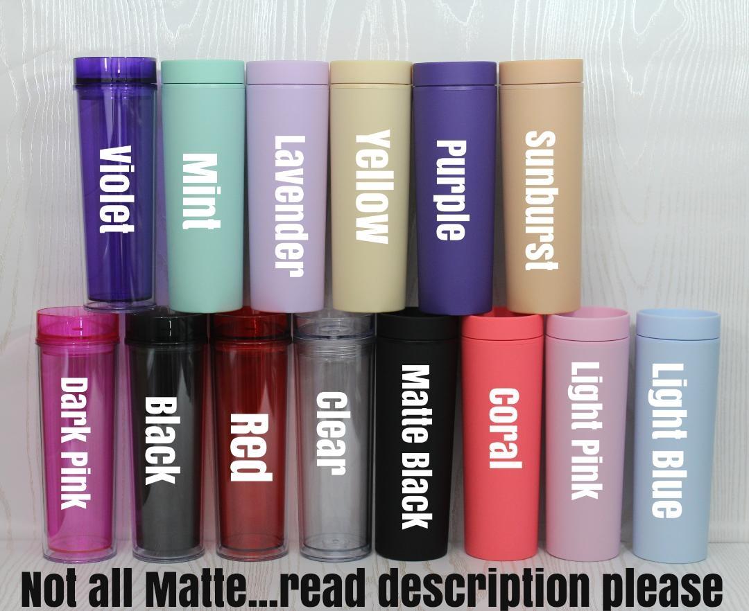 NOTE: Not all tumblers are Matte, some are more see through. Matte options are Mint, Lavender, Yellow, Purple, Sunburst, Matte Black, Coral, Light Pink and Light Blue. The non Matte are Violet, Dark Pink, Black, Red and Clear. ALSO NOTE that there are two Black options...one for the Matte Black and the other for the Black that is more see through.