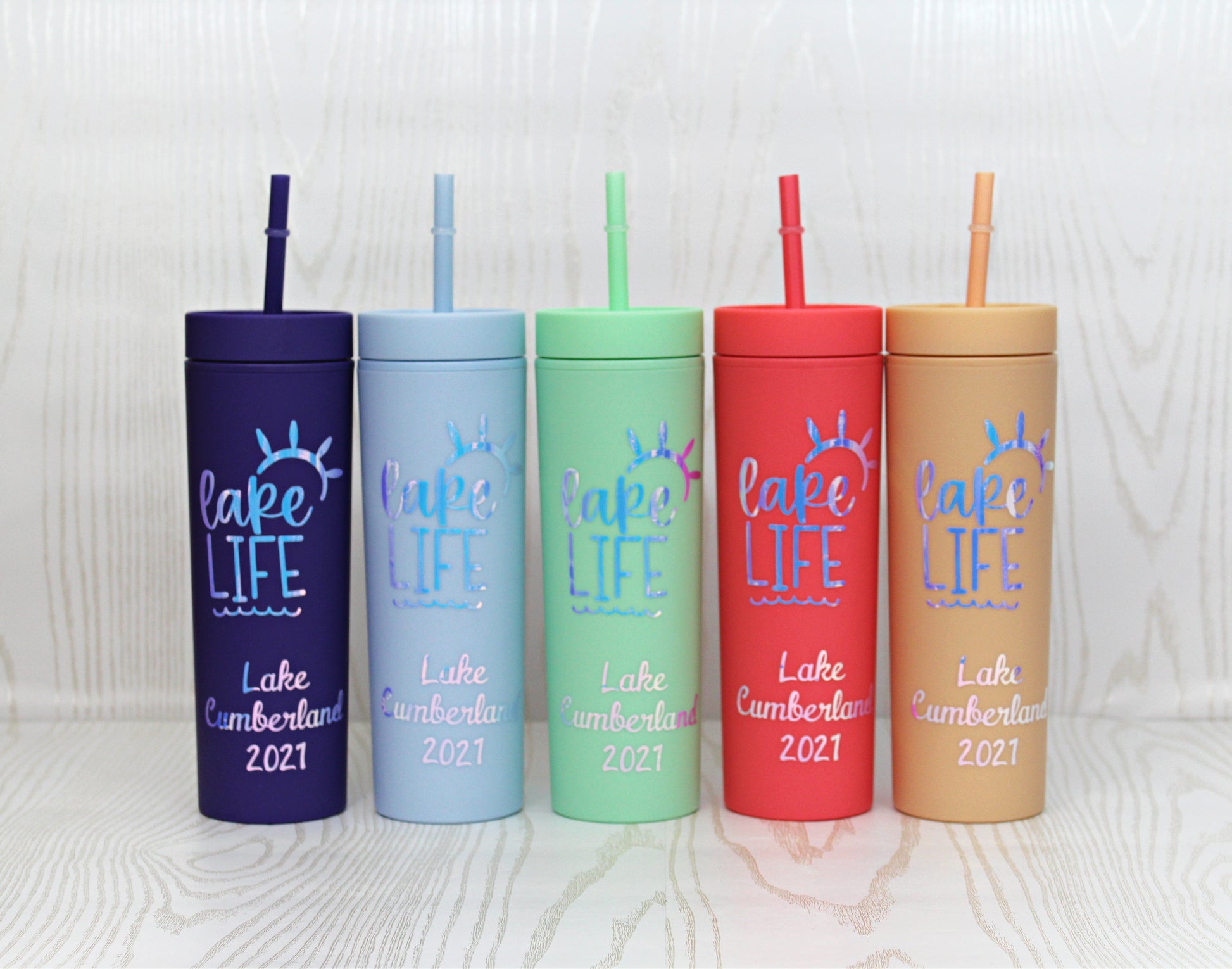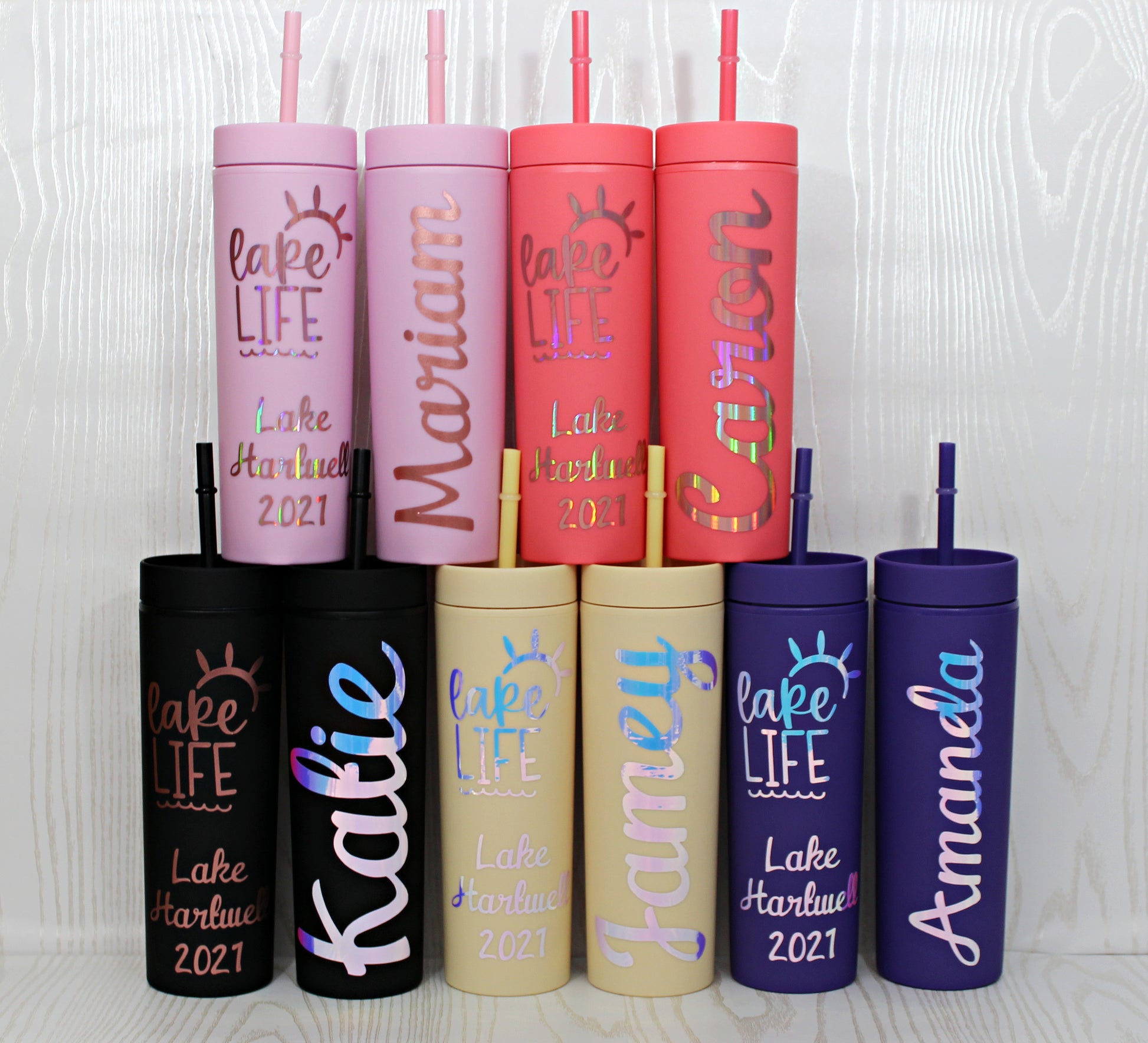 These two sided tumblers come with the Lake Life on one side and names on the other!