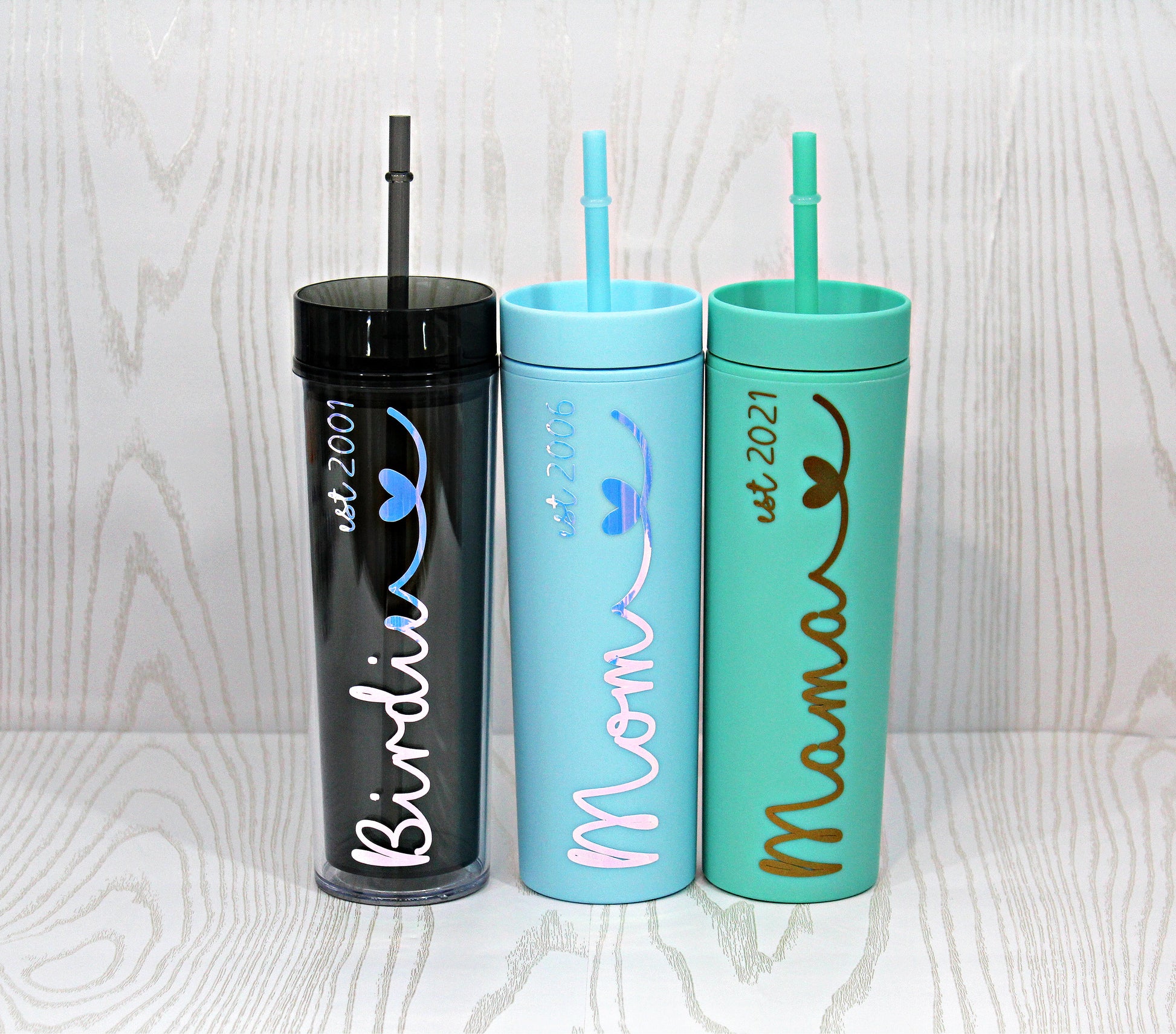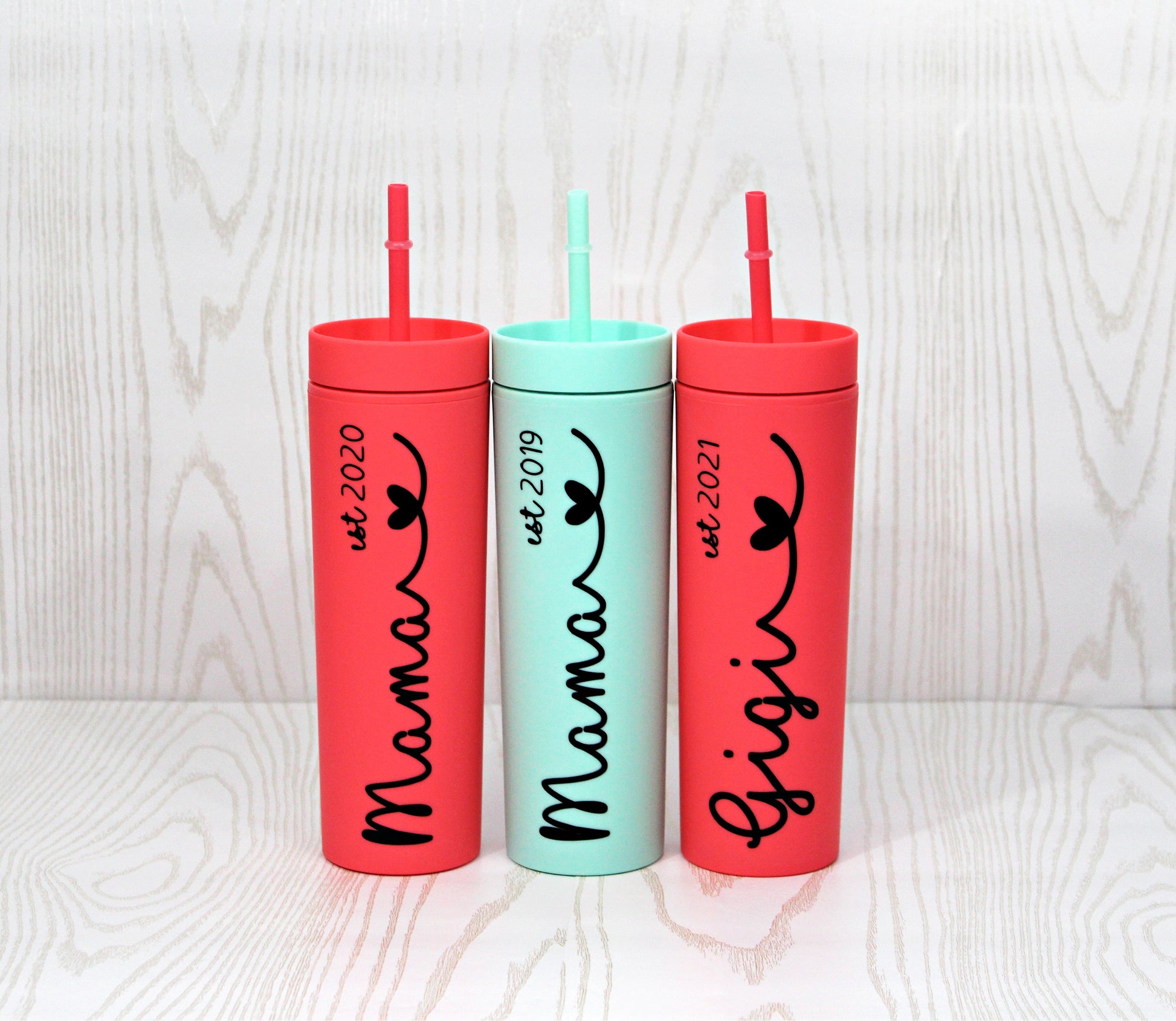 These Personalized tumblers are the perfect gift for just about anyone! Perfect for Weddings, Birthdays, Vacations or just a thoughtful gift for that special person! These Custom Tumblers make the perfect companion for your favorite Adult Beverage and so much more! These can also be made for other Mom or Grandma names such as Grandma, Nana, Mom, Momma!