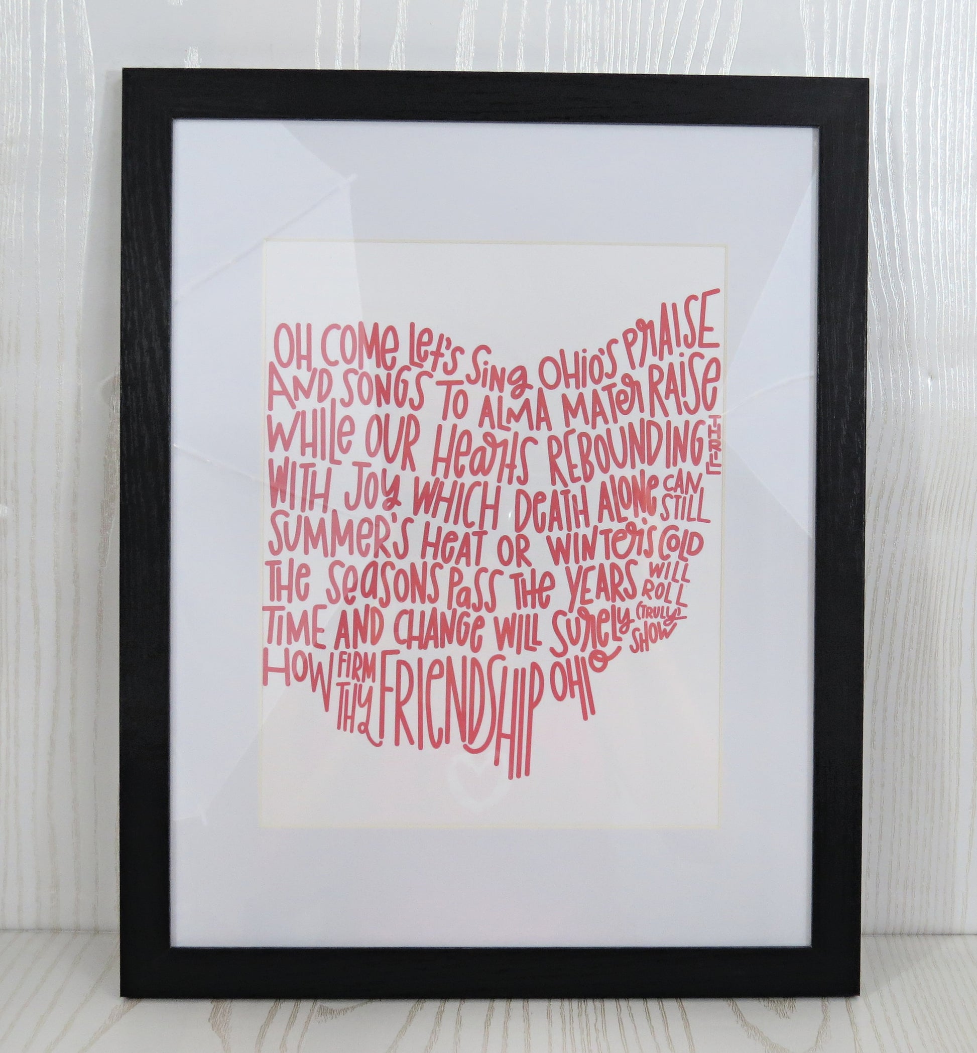 Option B: 11x14 Frame with 8x10 White Mat: 11x14 frame featuring an 8x10 print of the cherished Ohio song lyrics, beautifully surrounded by a crisp white mat
