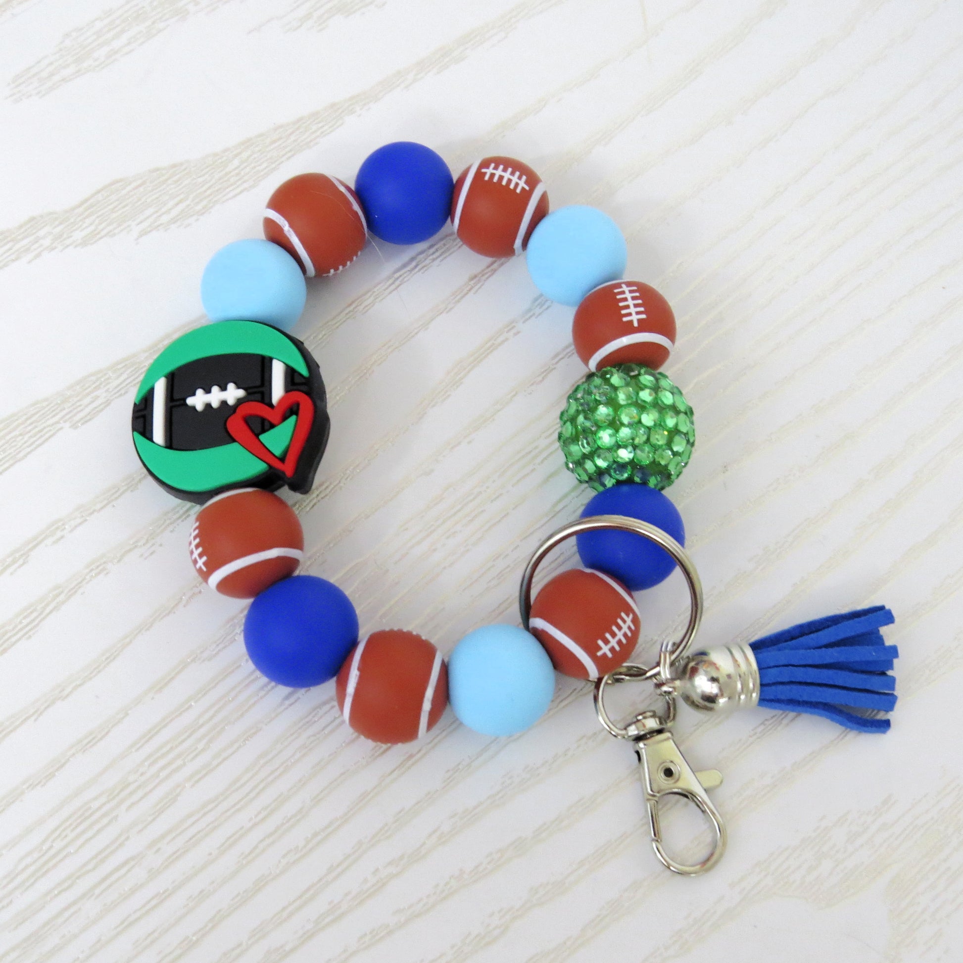 Football Beaded Wristlet with Green Bling Accent and Heart Charm – Game Day Keychain Bracelet for Moms & Fans