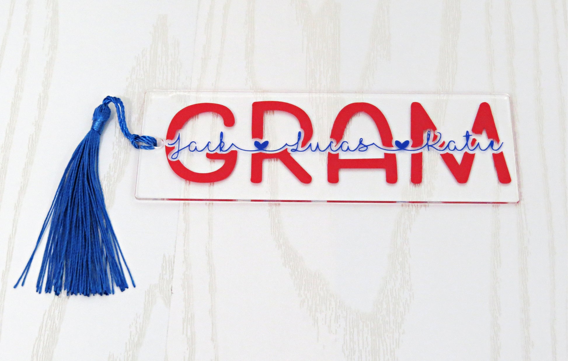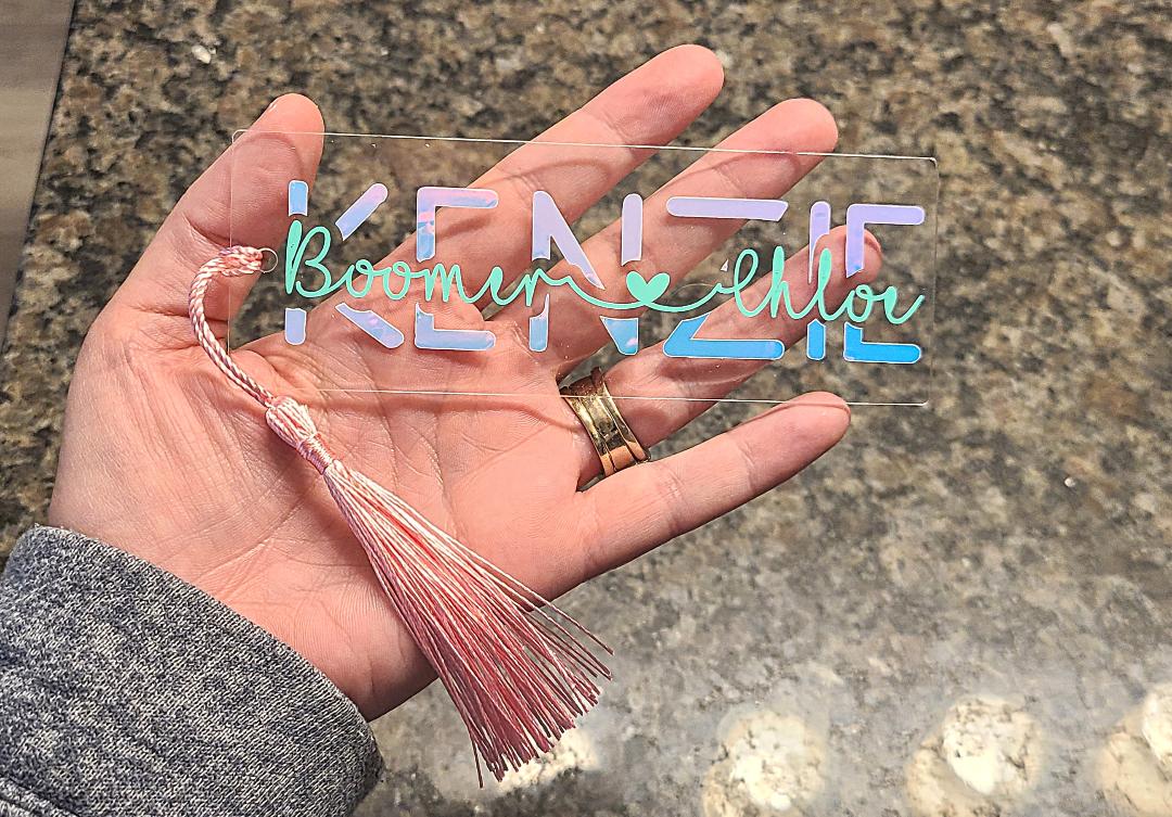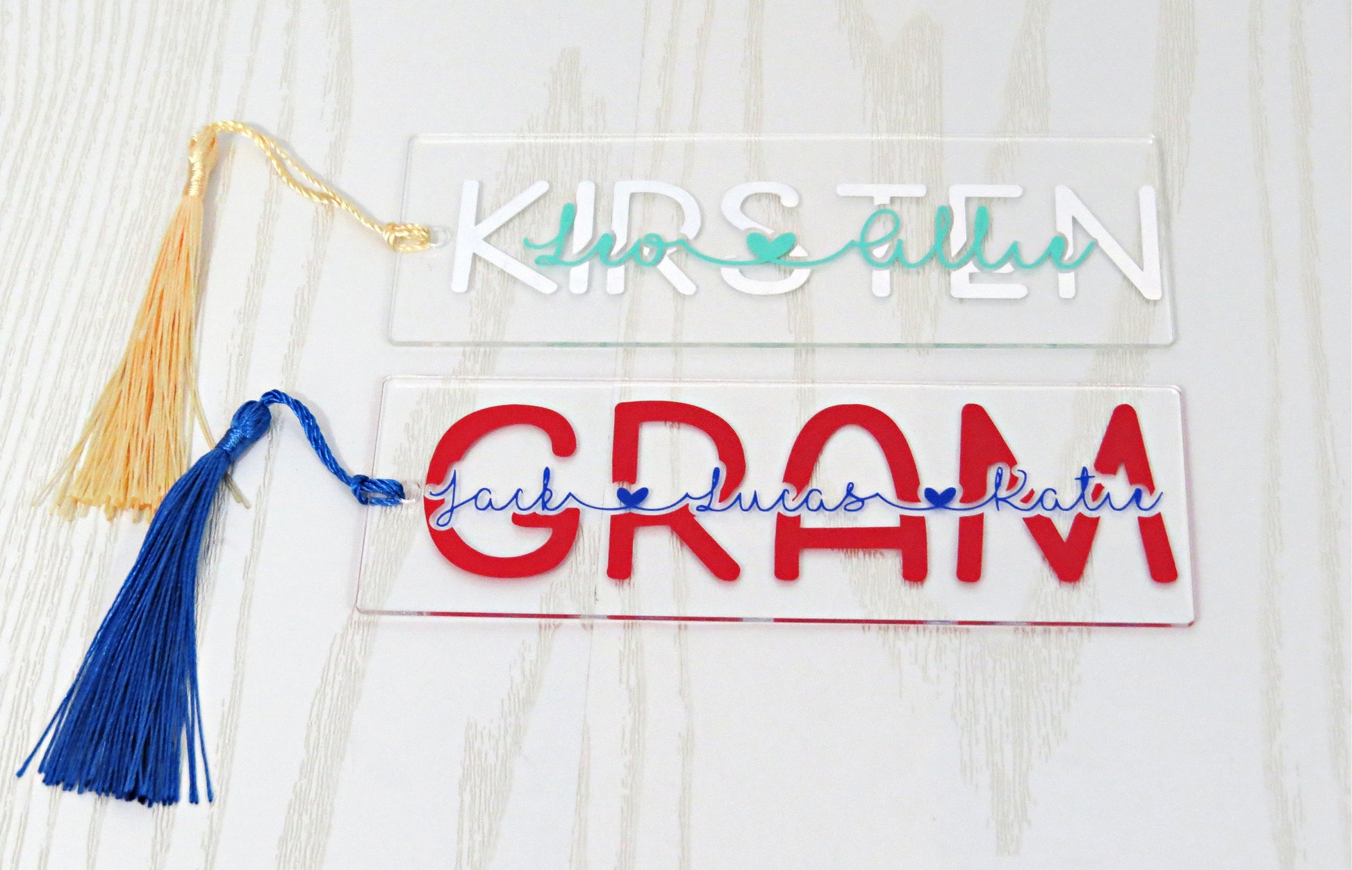 These personalized Bookmarks are a great gift for all! Comes with either a name or a Mom name (such as Mommy or Mama) typically with the kids names in small words. Would be a Mothers Day or birthday gift! Also you get to choose the vinyl colors too! Also great for kids with just the kids name or with pets names as the small section!