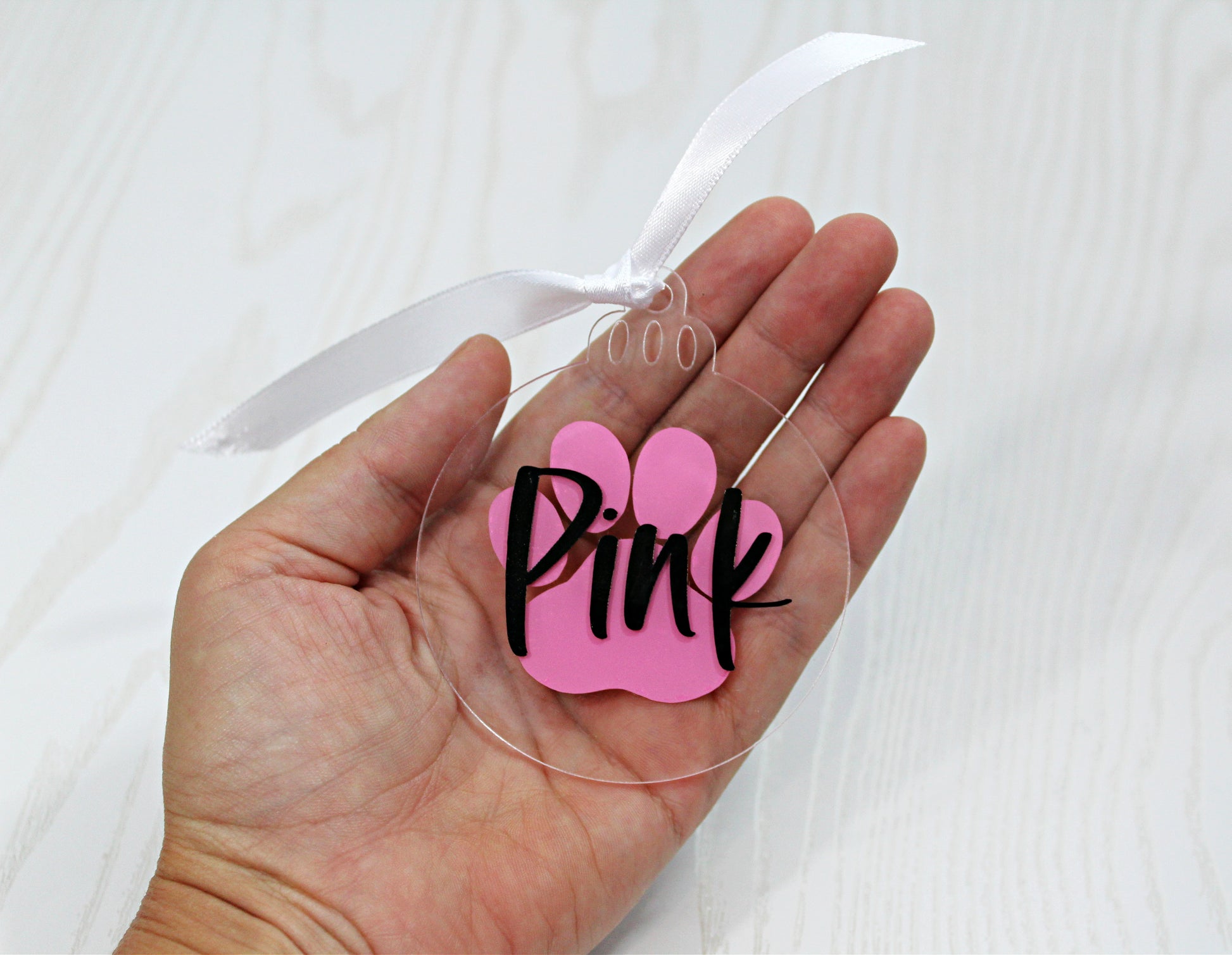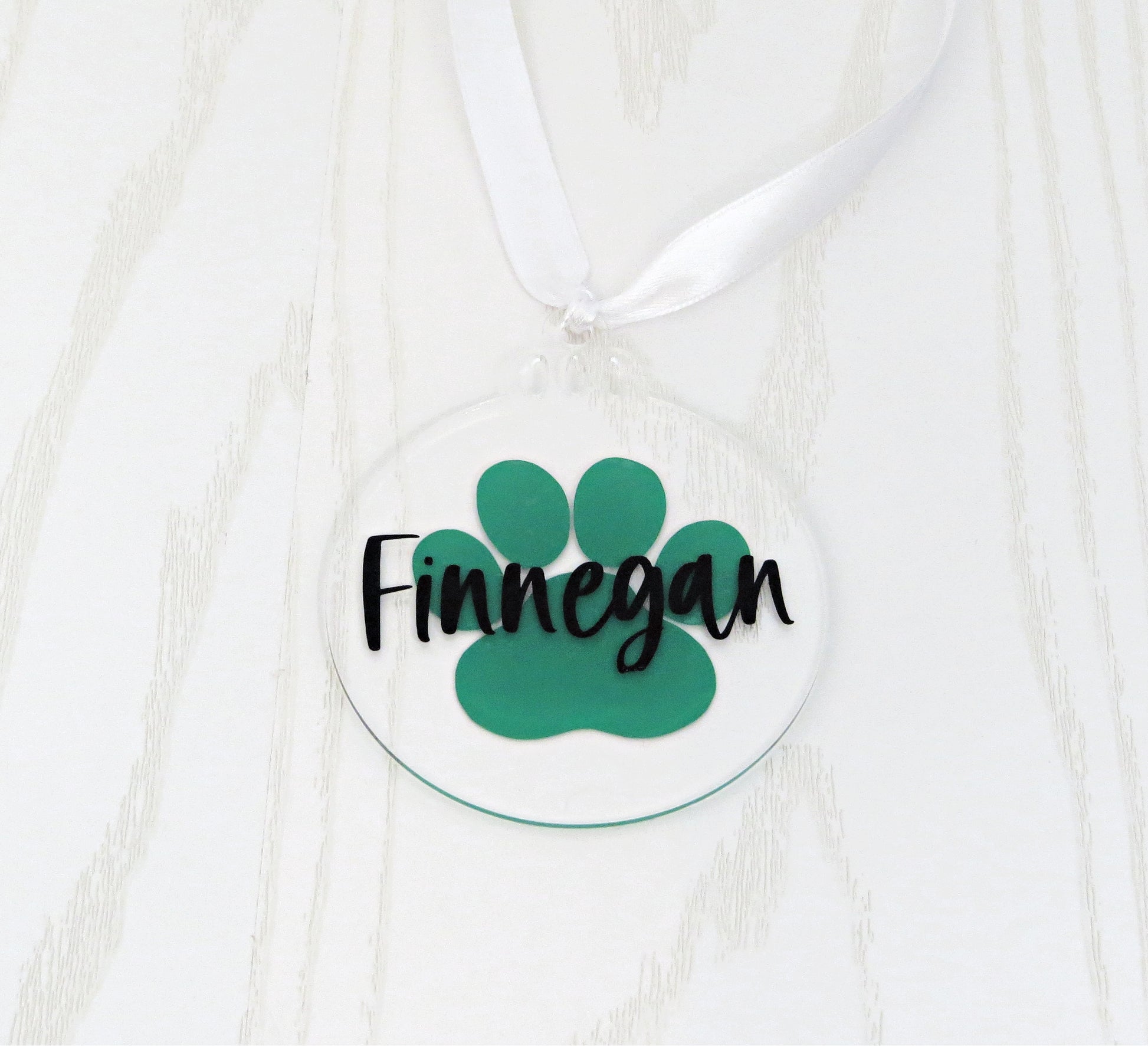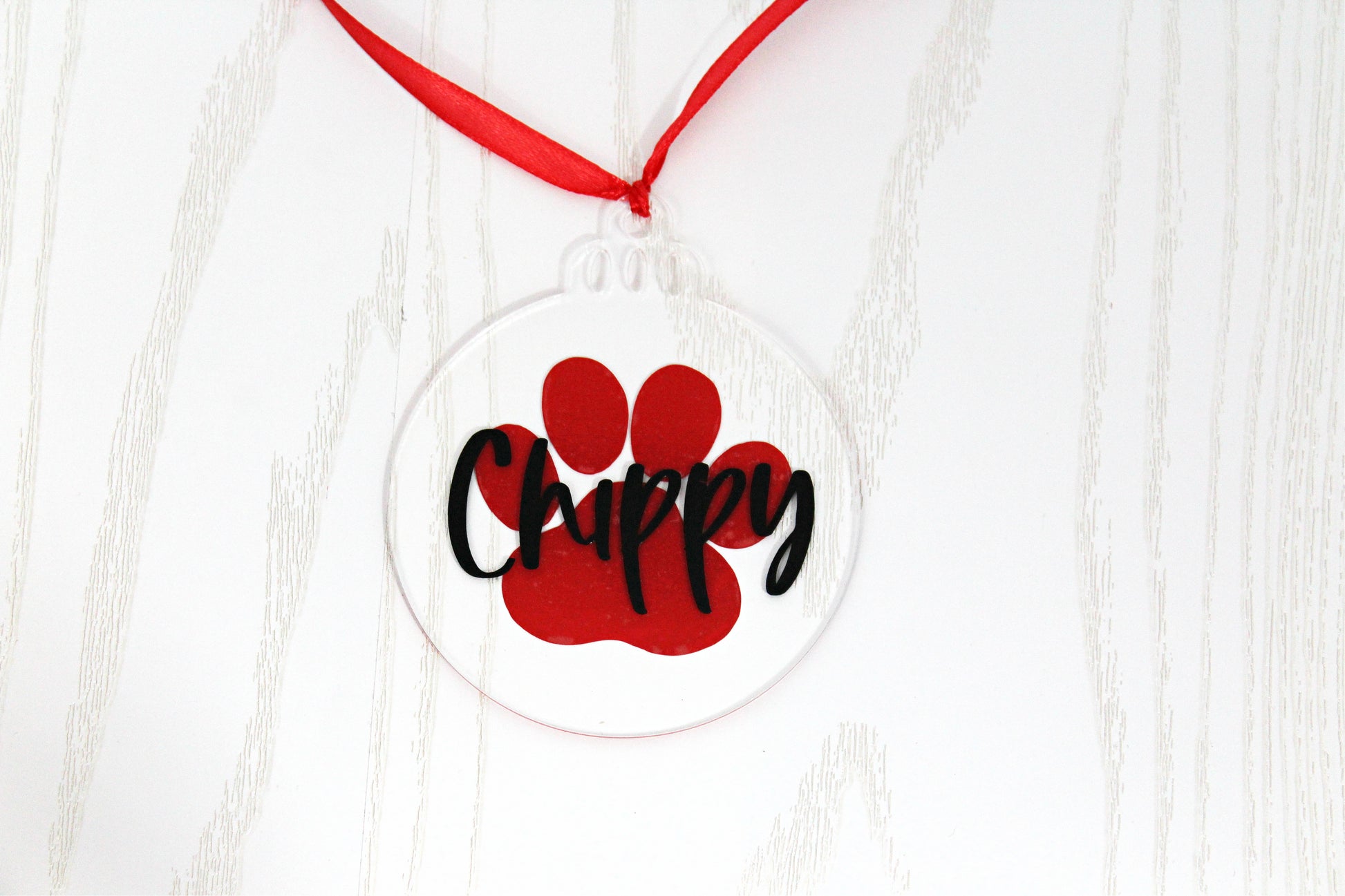 When checking out input the Pets Name you want on the ornament and your choice of vinyl color for the Paw on the ornament (see color choices in the pictures).